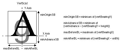 An example of the minOriginSB, minAdvanceSB, maxBeforeBL, and minAfterBL values for horizontal text is given in the following figure. These values are calculated from the min and max values of the glyph metrics, which come from the bitmap data table.