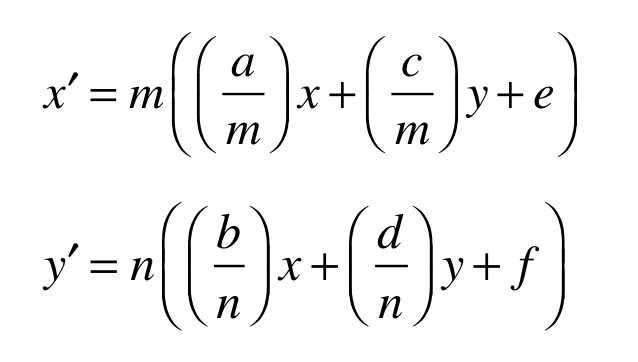 The transformation entries determine the values of an affine transformation applied to the component prior to its being incorporated into the parent glyph. Given the component matrix [a b c d e f], the transformation applied to the component is: