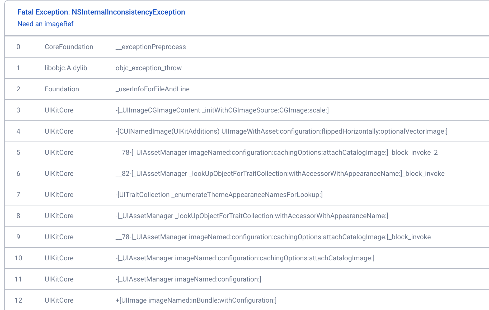 The stack trace is: Fatal Exception: NSInternalInconsistencyException Need an imageRef Have you encountered similar problems?