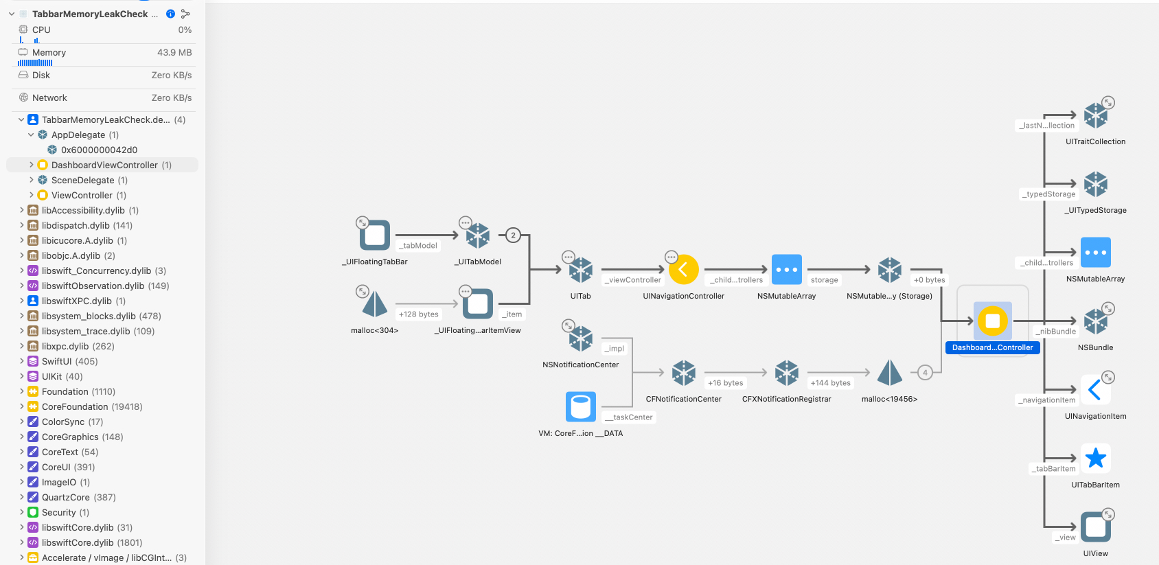 That all works fine, and when I tap the back button on MyTabBarController, everything works fine and the MainViewController is shown again. The UI works exactly how I want it, but when I load up the 'Debug Memory Graph' view, I can see that my DashboardViewController is still in memory and it seems the UITab has a reference to it. The MyTabBarController is NOT in memory anymore.