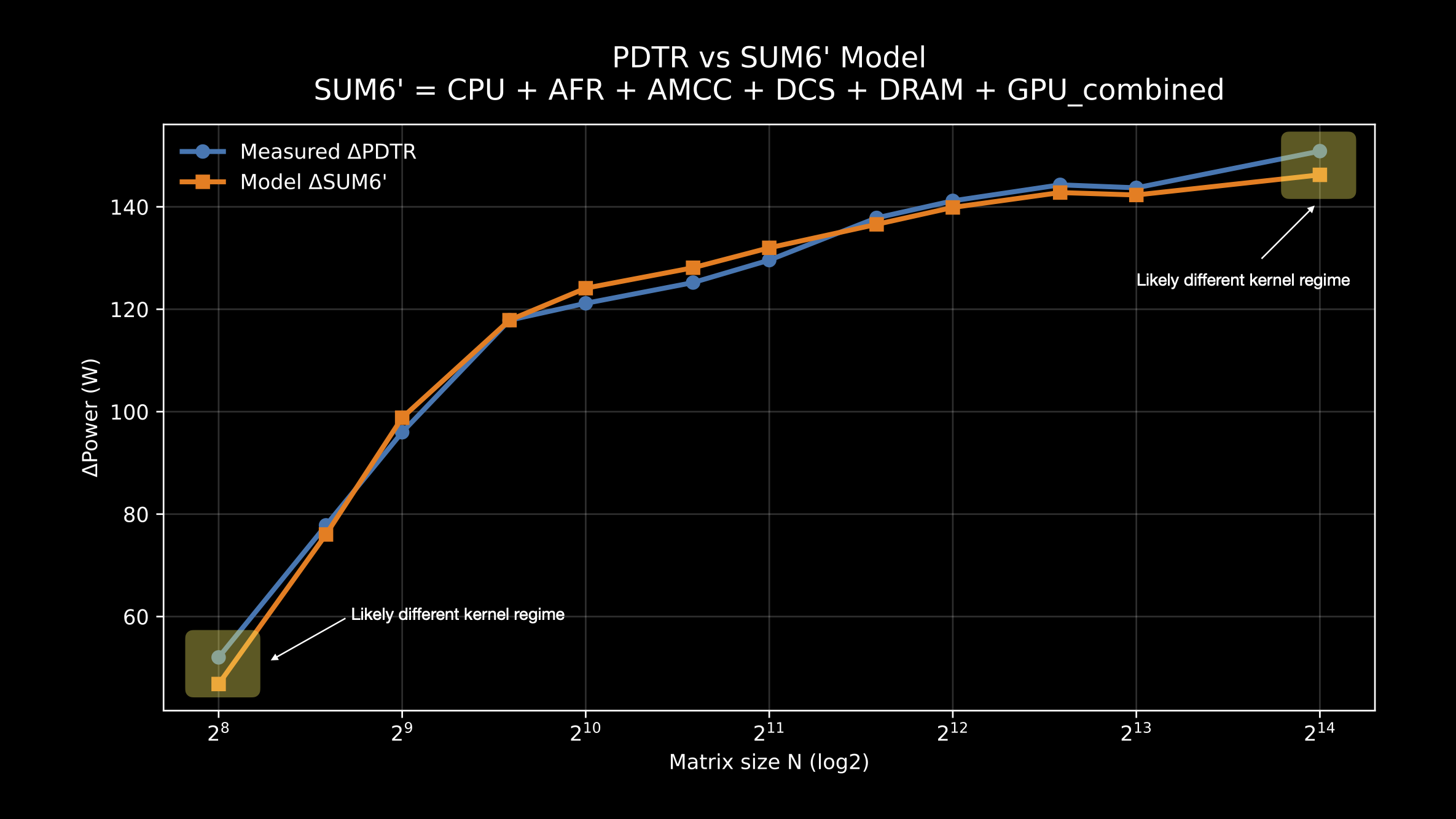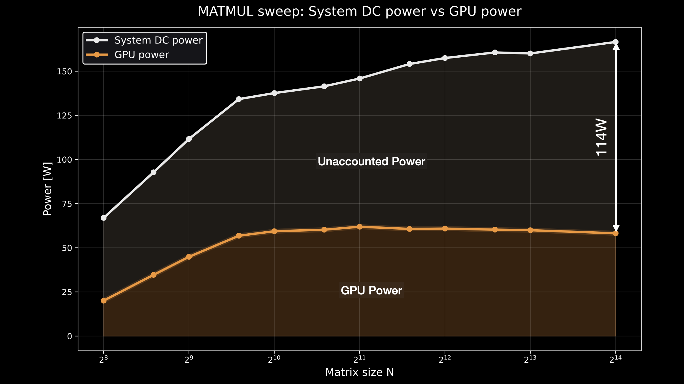 From measurements, the difference appears to correlate with the amount of on-chip data movement (for example, varying bytes-per-FLOP in the workload changes the observed gap). Using SMC and IOReport, I was able to reverse engineer an energy model for the GPU that explains almost all of the energy flow with less than 2% error on the workload I studied.