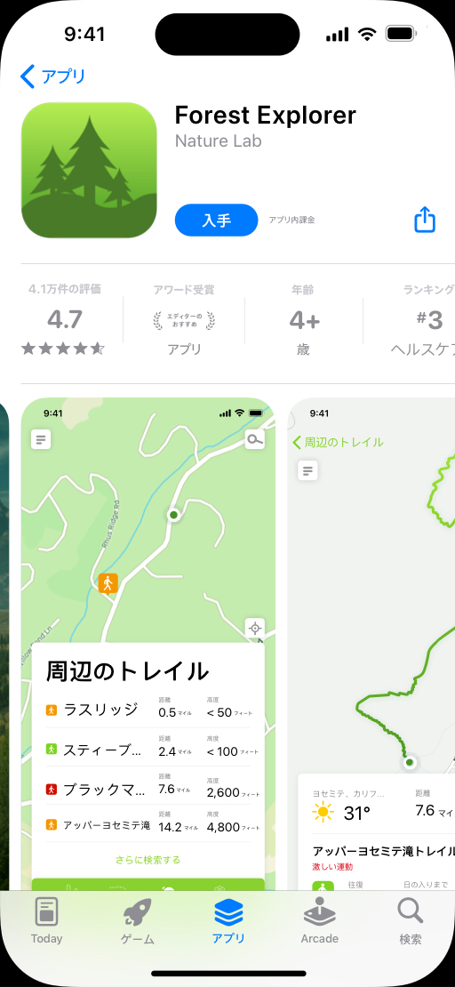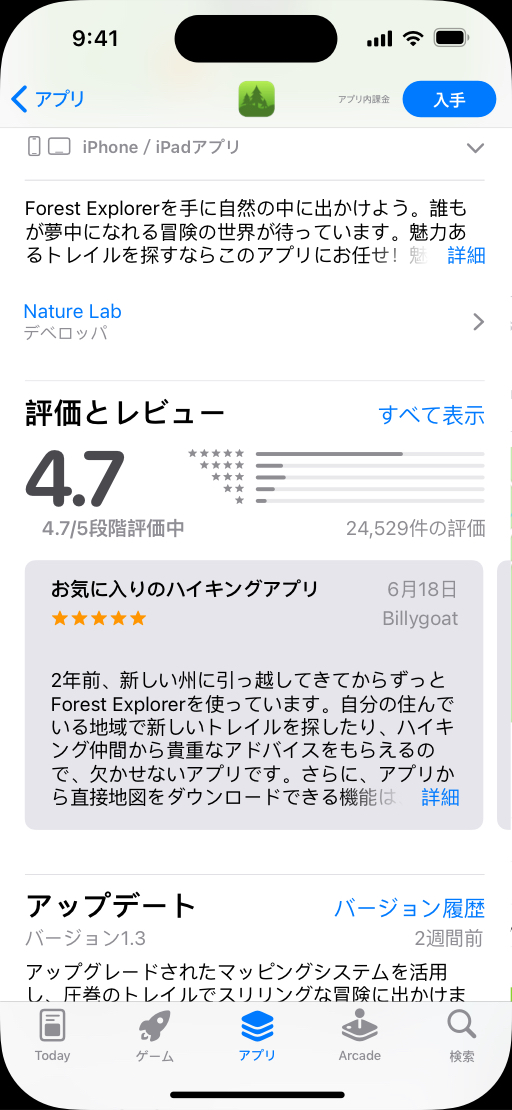 評価とレビューは、検索結果にアプリが表示される順位を左右し、検索結果でユーザーに興味を持ってもらえるかどうかに影響します。ユーザーから好意的なレビューを受けられるよう、質の高いアプリ体験の提供に注力しましょう。アプリの総合評価は、プロダクトページや検索結果に表示されます。この総合評価は、App Storeの各テリトリごとに表示されます。