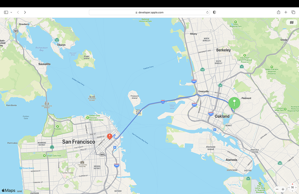 MapKit JSを使うと、macOS、Windows、Androidを含む各種プラットフォームおよびオペレーティングシステム上のWebサイトにインタラクティブな地図を直接埋め込むことができます。アプリでのMapKitと同様に、地図に注釈やオーバーレイを追加して、見どころやユーザーの目的地を目立たせることができます。