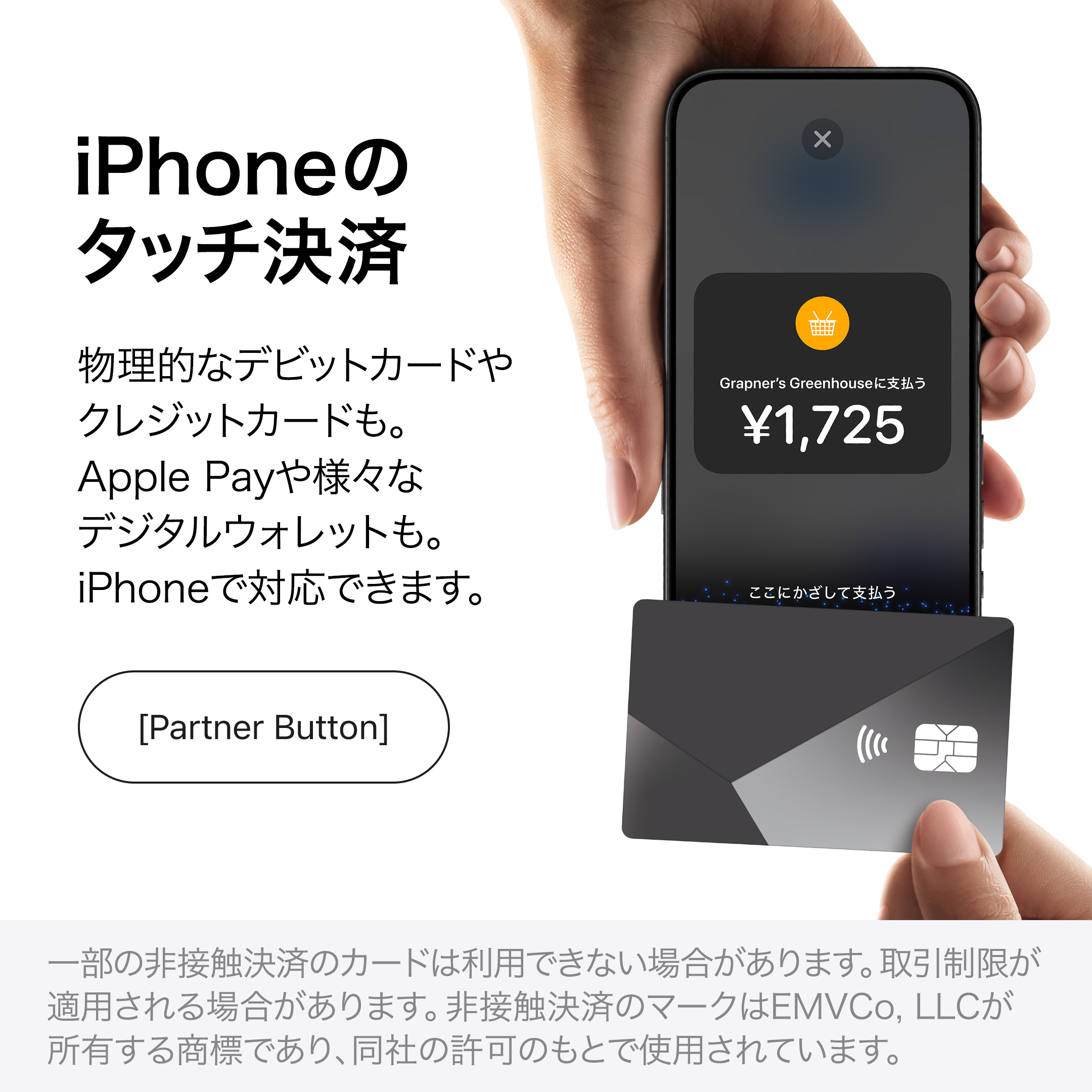 - iPhoneのタッチ決済に関するマーケティングキットに含まれる、Appleが承認したマーケティングアセットを使用します。