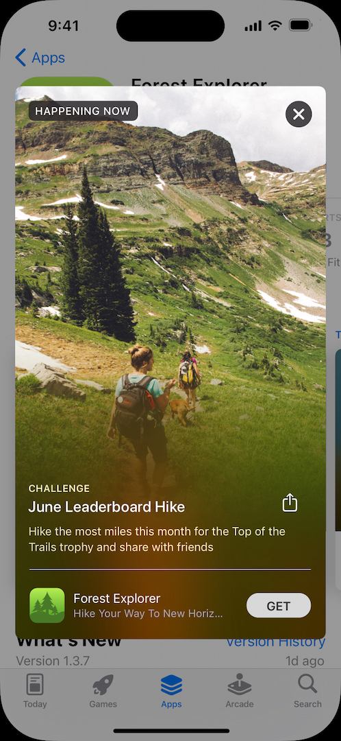 앱 내 이벤트는 이미지나 비디오, 이벤트 이름 및 간단한 설명을 포함하는 이벤트 카드의 형태로 App Store 전반에 표시됩니다(iOS 15 및 iPadOS 15 이후 버전). 이벤트 카드를 탭하면 이벤트에 대한 자세한 설명과 이벤트 참여를 위해 앱 내 구입 및 구독의 필요 여부를 확인할 수 있는 이벤트 상세 페이지가 몰입감 있는 경험을 선사합니다. 상세 페이지에서 메시지 또는 소셜 미디어를 통해 이벤트를 다른 사람과 공유할 수 있습니다. 이벤트 카드 및 이벤트 상세 페이지에서 알림 받기를 선택해 이벤트가 시작될 때 App Store에서 알림을 받을 수도 있습니다.