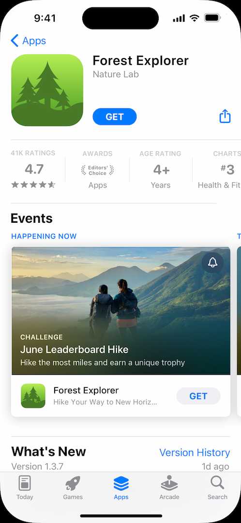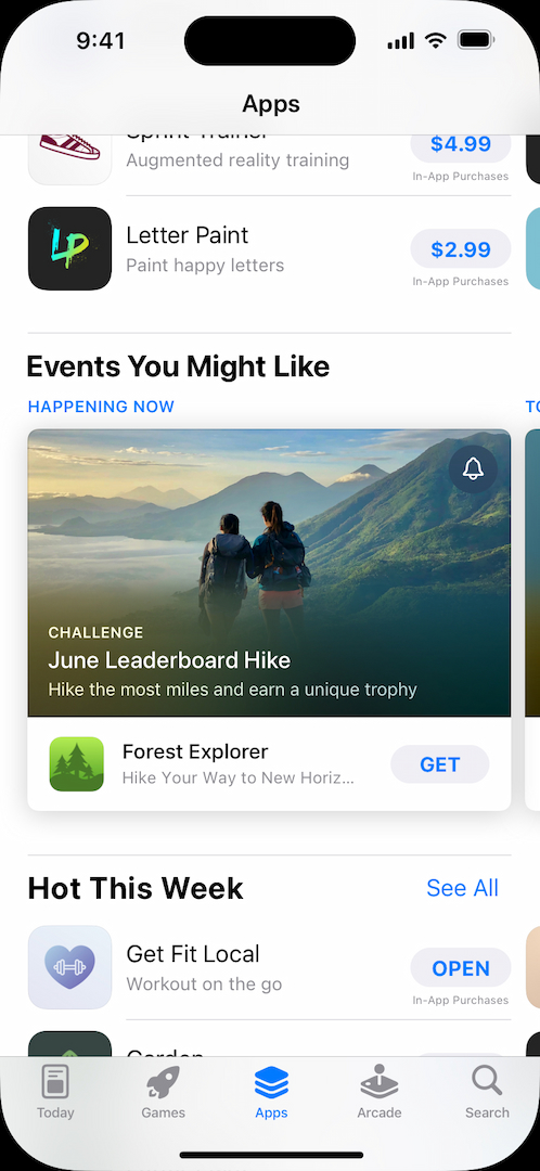 또한 Apple의 글로벌 에디터 팀과 앱 내 이벤트를 공유하여 App Store에서의 홍보를 고려해 볼 수도 있습니다. Apple은 새로 출시되거나 중요한 업데이트가 있는 앱과 게임, 앱 내 이벤트나 독점 콘텐츠, 문화 이벤트 또는 시즌 이벤트 등을 집중 소개합니다.