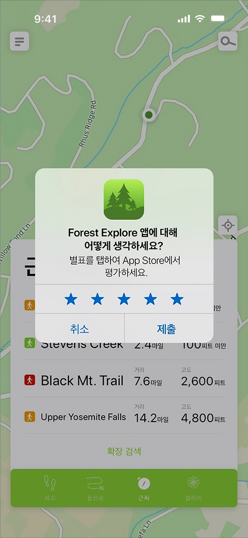 SKStoreReviewController API를 사용하면 사용자가 손쉽게 앱에 대한 피드백을 제공할 수 있습니다. 1년에 최대 3번까지 평가를 요청할 수 있습니다. 사용자는 표준 프롬프트를 통해 평가를 제출하며 앱에서 나가지 않고도 리뷰를 작성하고 제출할 수 있습니다.