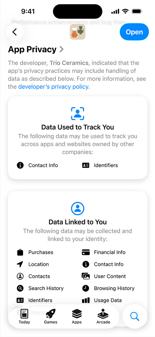 개발자는 App Tracking Transparency 요청을 통해 앱에서 수집하고 추적에 사용하는 데이터에 대해 허가를 받아야 합니다. 이때 앱 외부에서 별도로 수집하고 해당 앱과 관련이 없는 데이터는 해당되지 않습니다.