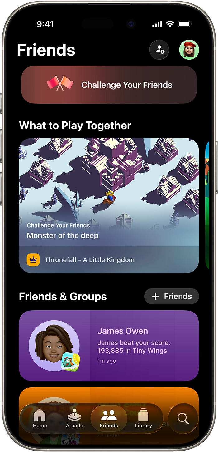 Friends(친구) 탭에서는 플레이어가 친구들과 지속적으로 소통하고 친구들이 플레이하고 있는 새로운 게임을 확인할 수 있습니다. 또한 친구를 챌린지나 멀티플레이어 매치에 초대할 뿐만 아니라, 점수와 목표 달성을 비교할 수도 있습니다.