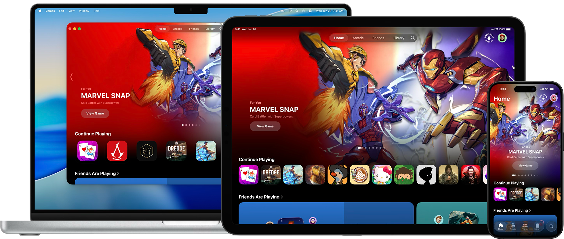 App Store에서 제공되는 게임은 검색 결과, Library(보관함) 탭, Continue Playing(계속 플레이하기) 섹션 등 Games 앱에 자동으로 표시됩니다. 또한 Game Center 기능과 앱 내 이벤트를 포함하는 게임은 Games 앱 전반에서 눈에 띄게 표시되어 플레이어가 해당 게임을 발견하고 더욱 깊이 참여할 수 있도록 도와줍니다.