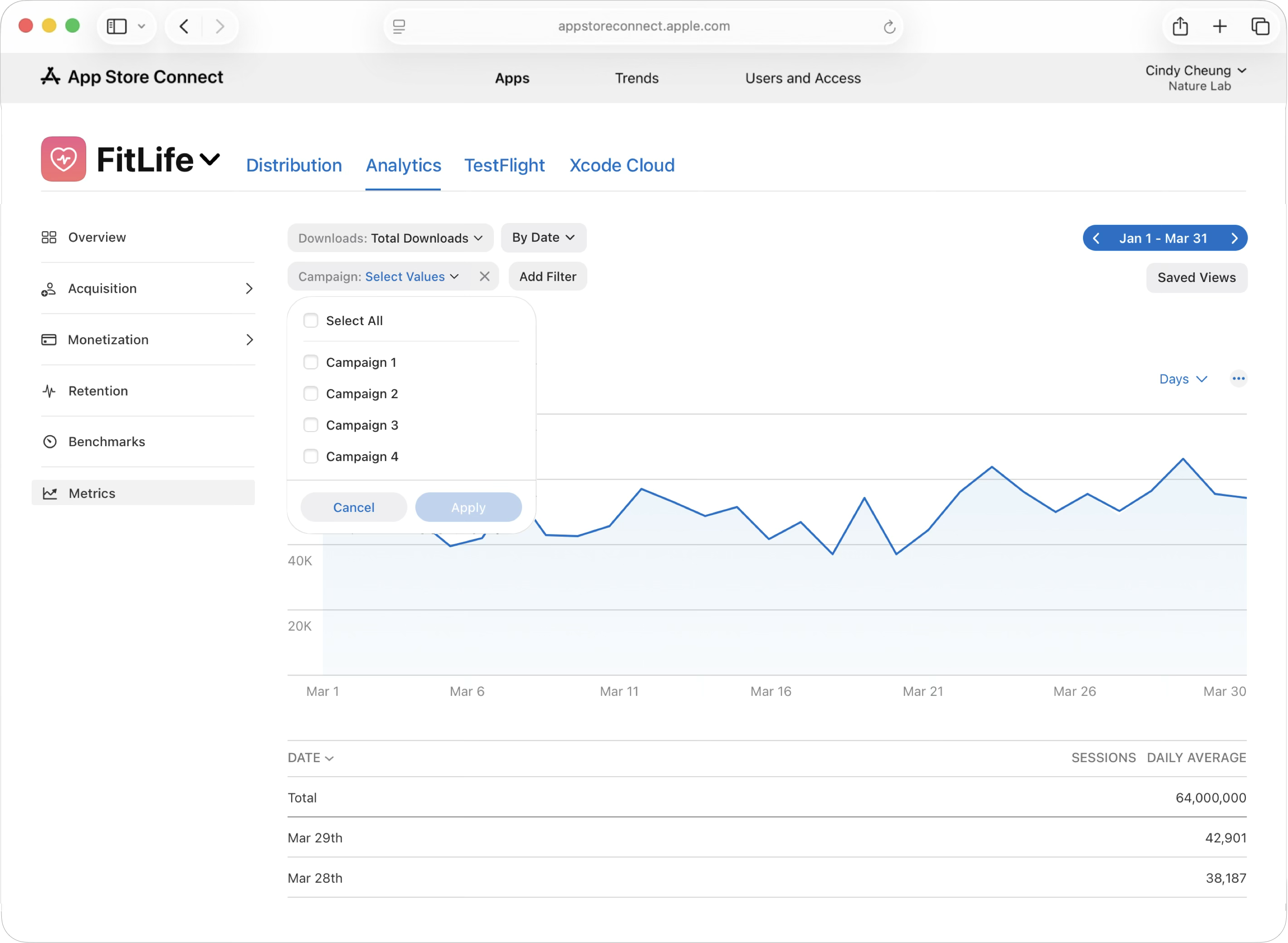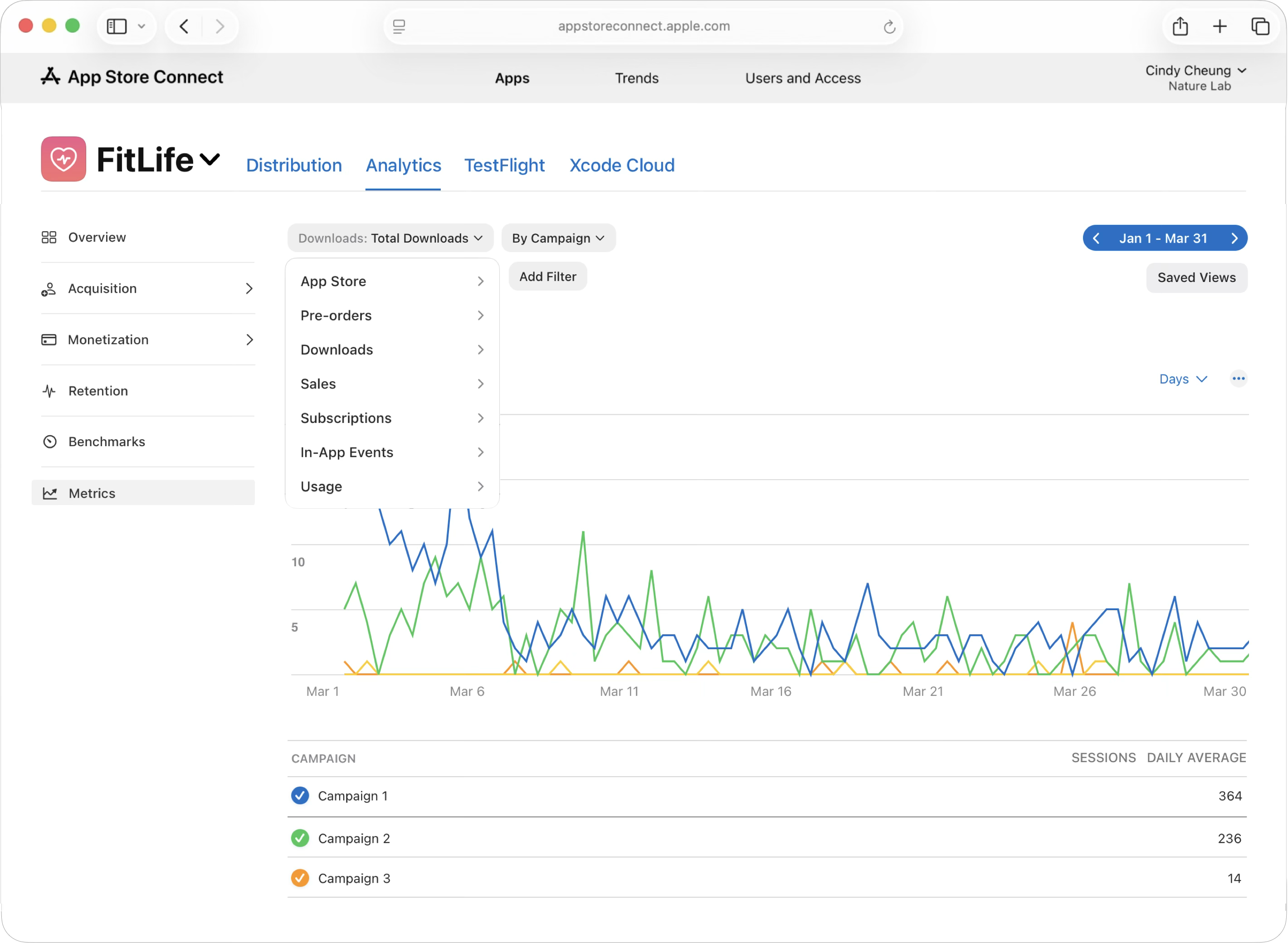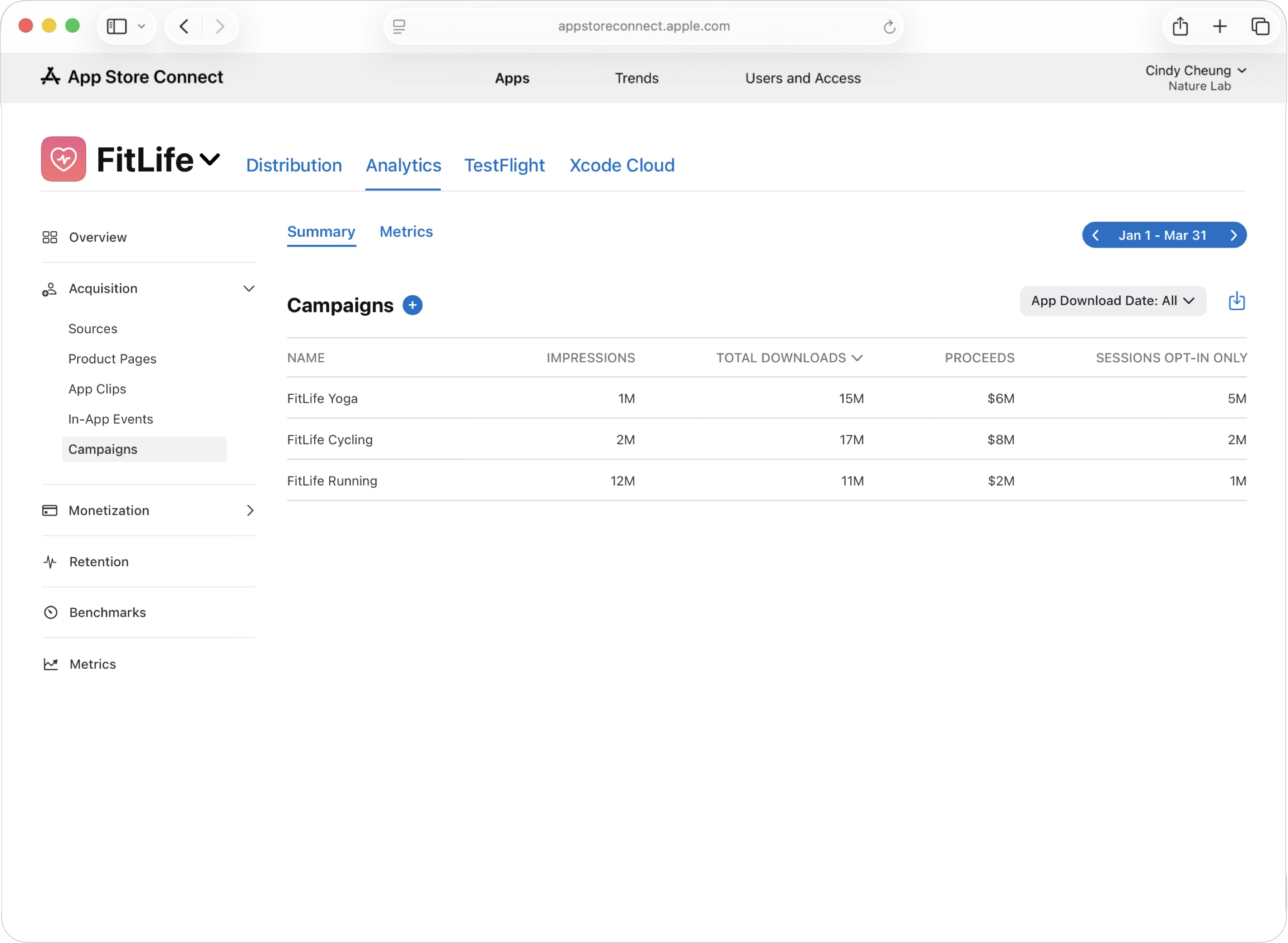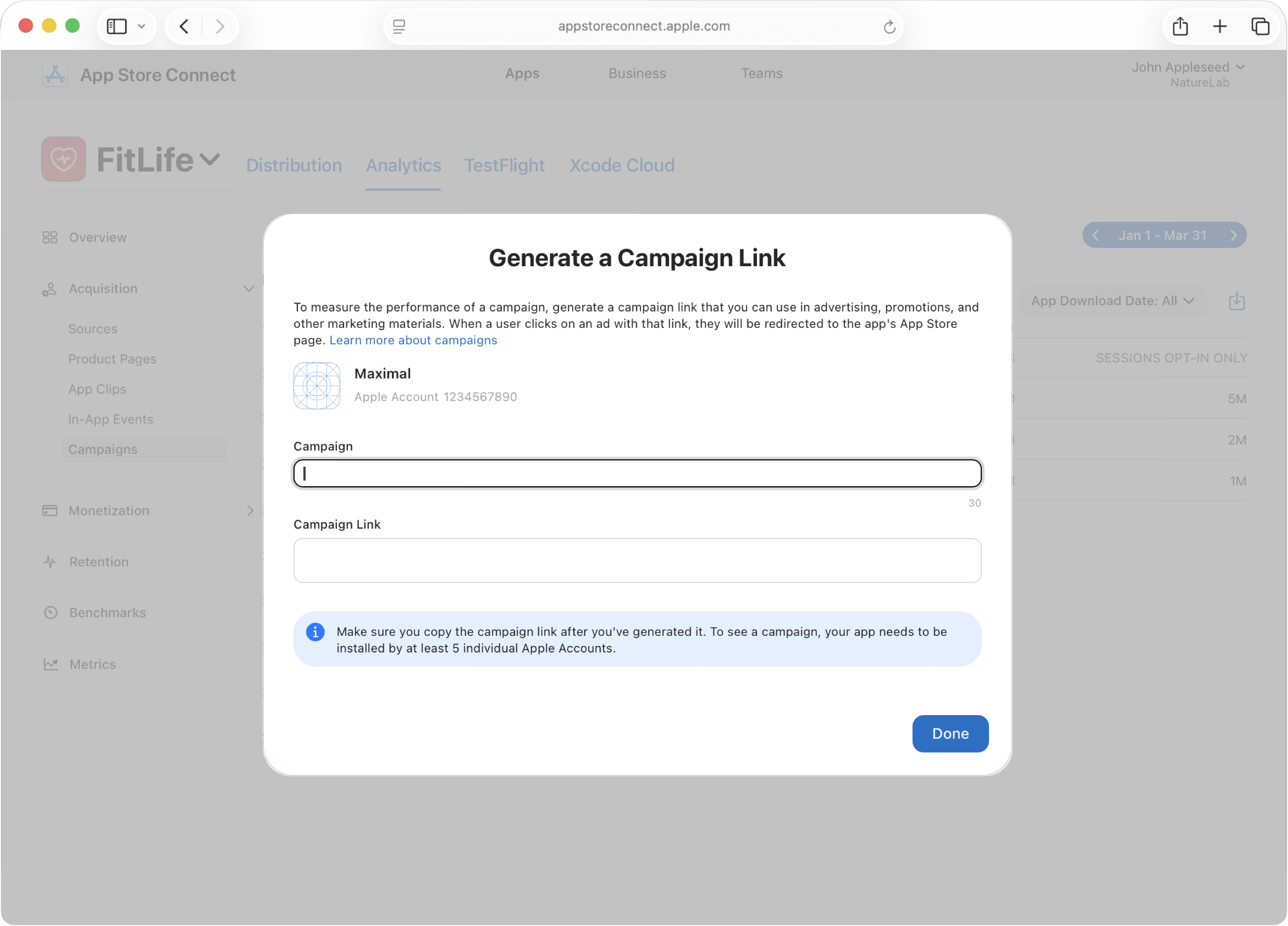App Store Connect의 “분석” 기능은 마케팅 자료를 위한 캠페인 링크를 생성할 수 있도록 하여 구체적인 캠페인 성과를 측정하고, 어떤 마케팅 활동이 가장 많은 앱 다운로드를 유도하였는지 파악할 수 있도록 합니다.