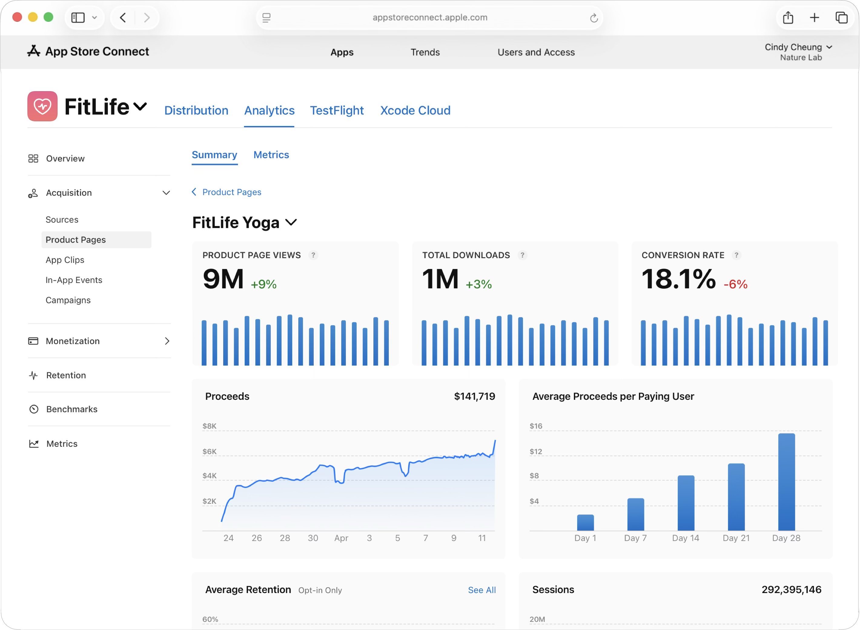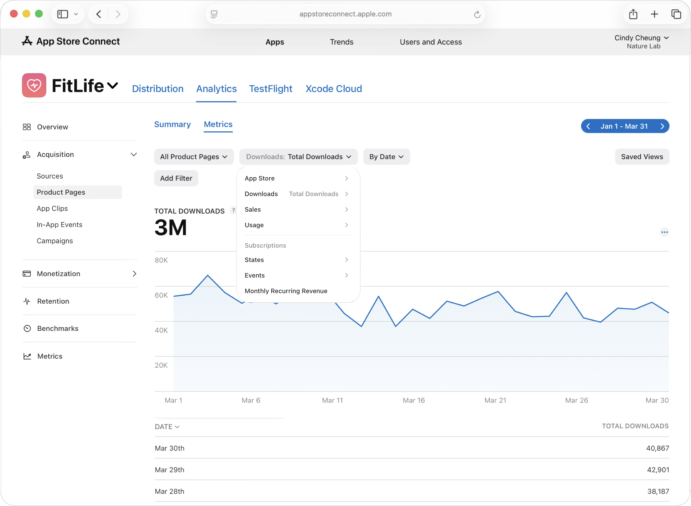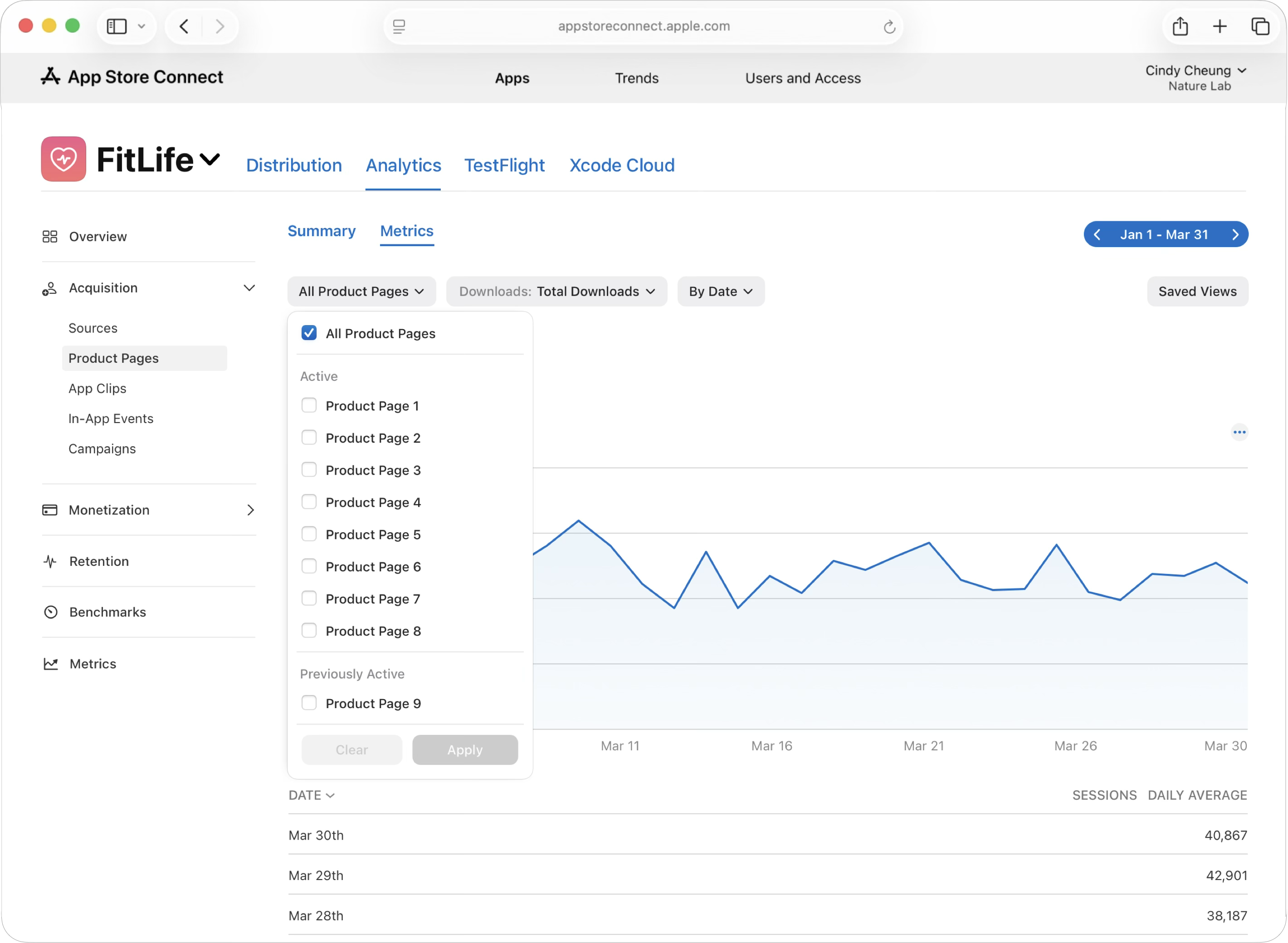 App Store Connect의 “분석” 기능을 통해 제품 페이지 조회수, 다운로드 수, 전환율 등 전체 고객 여정 지표와 함께 구독 성과 및 매출과 같은 후속 지표까지 페이지별로 측정할 수 있습니다. 이를 통해 어떤 페이지가 가장 높은 전환율을 보이는지, 그리고 어떤 페이지가 가장 가치가 높은 사용자를 유입하는지 평가할 수 있습니다.