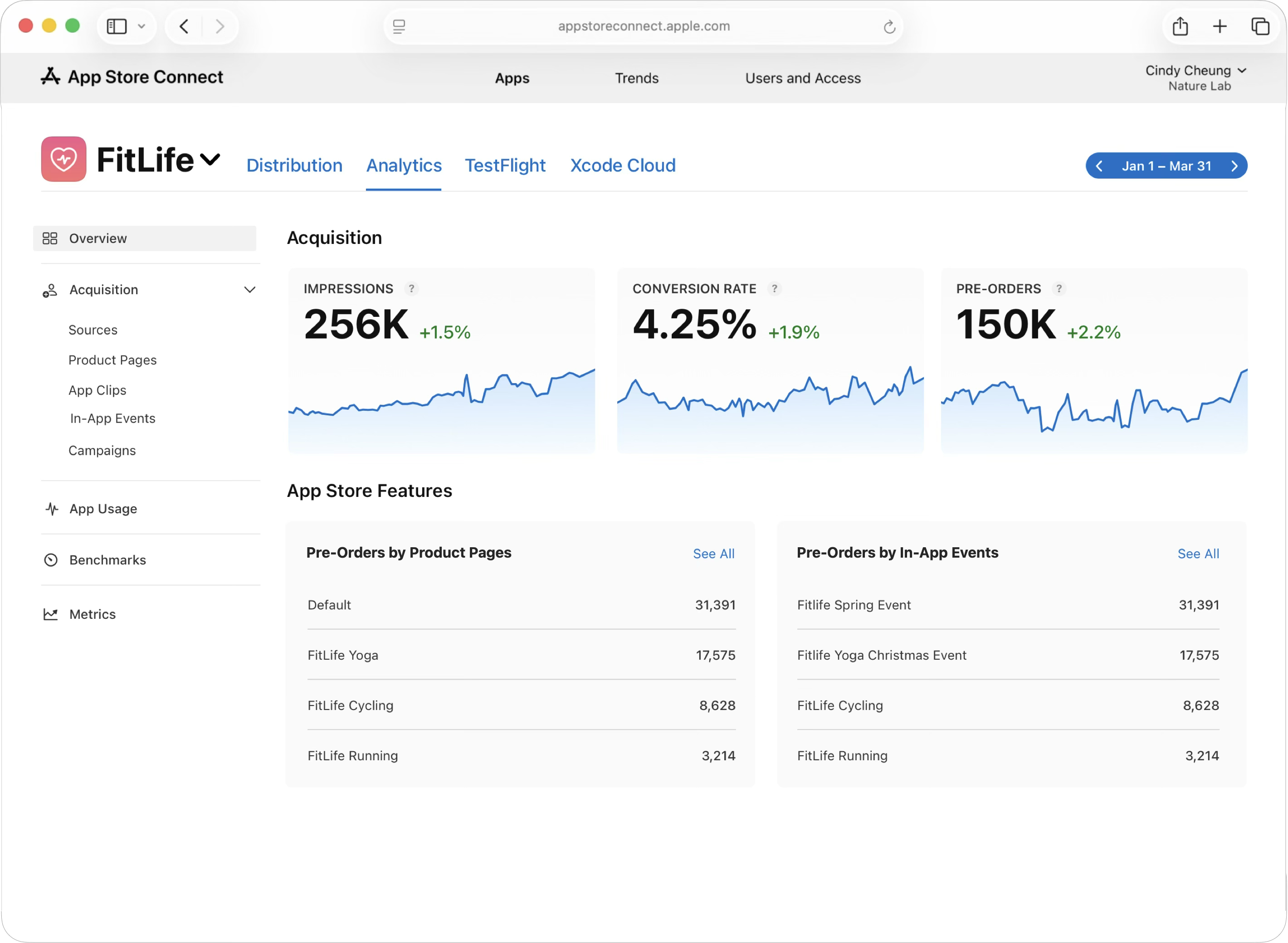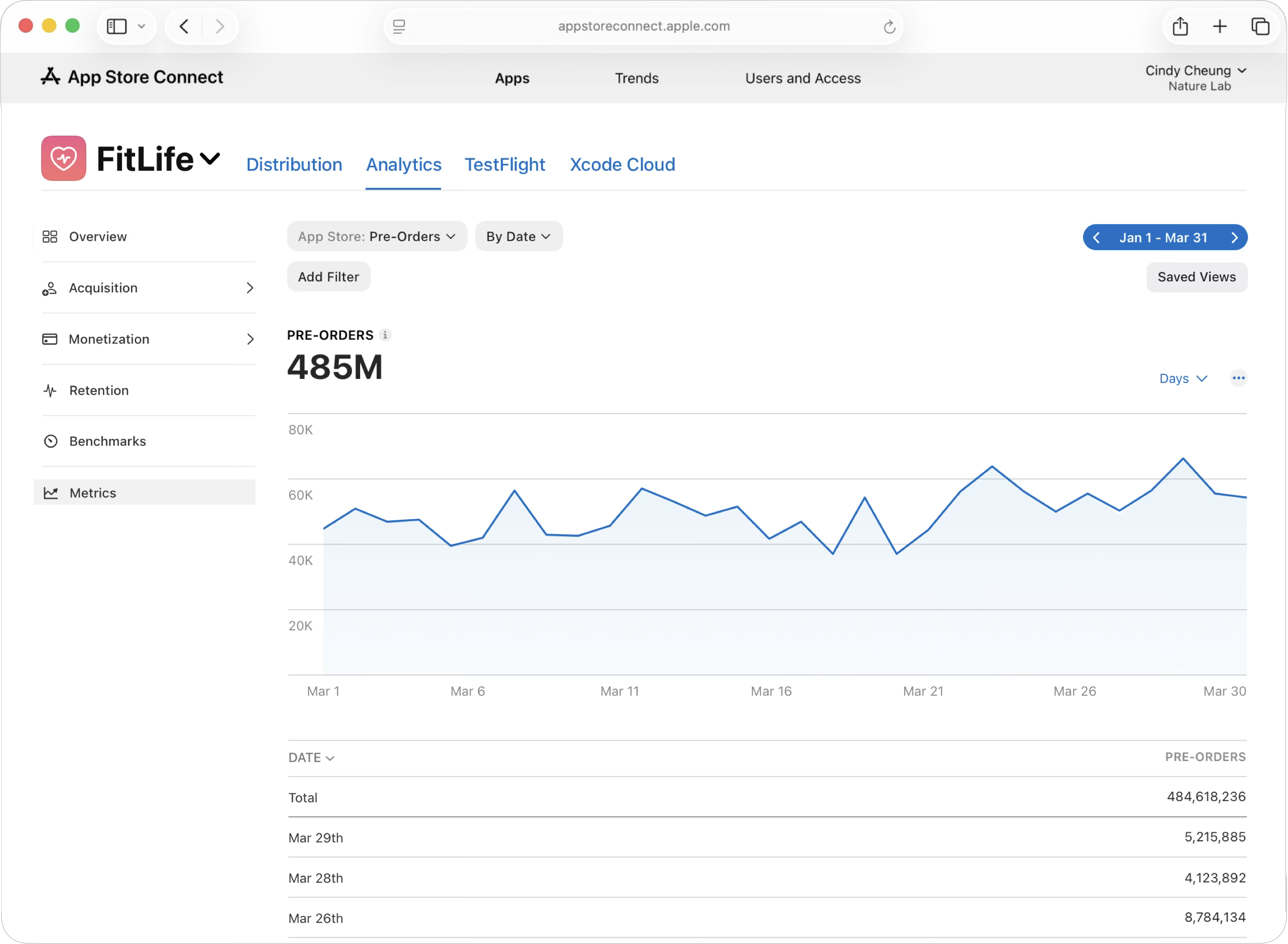 App Store Connect의 “분석”에서 순 사전 주문(사전 주문에서 사전 주문 취소를 제외한 값), 사전 주문 전환율, 사전 주문으로 인한 다운로드 등을 측정할 수 있습니다.