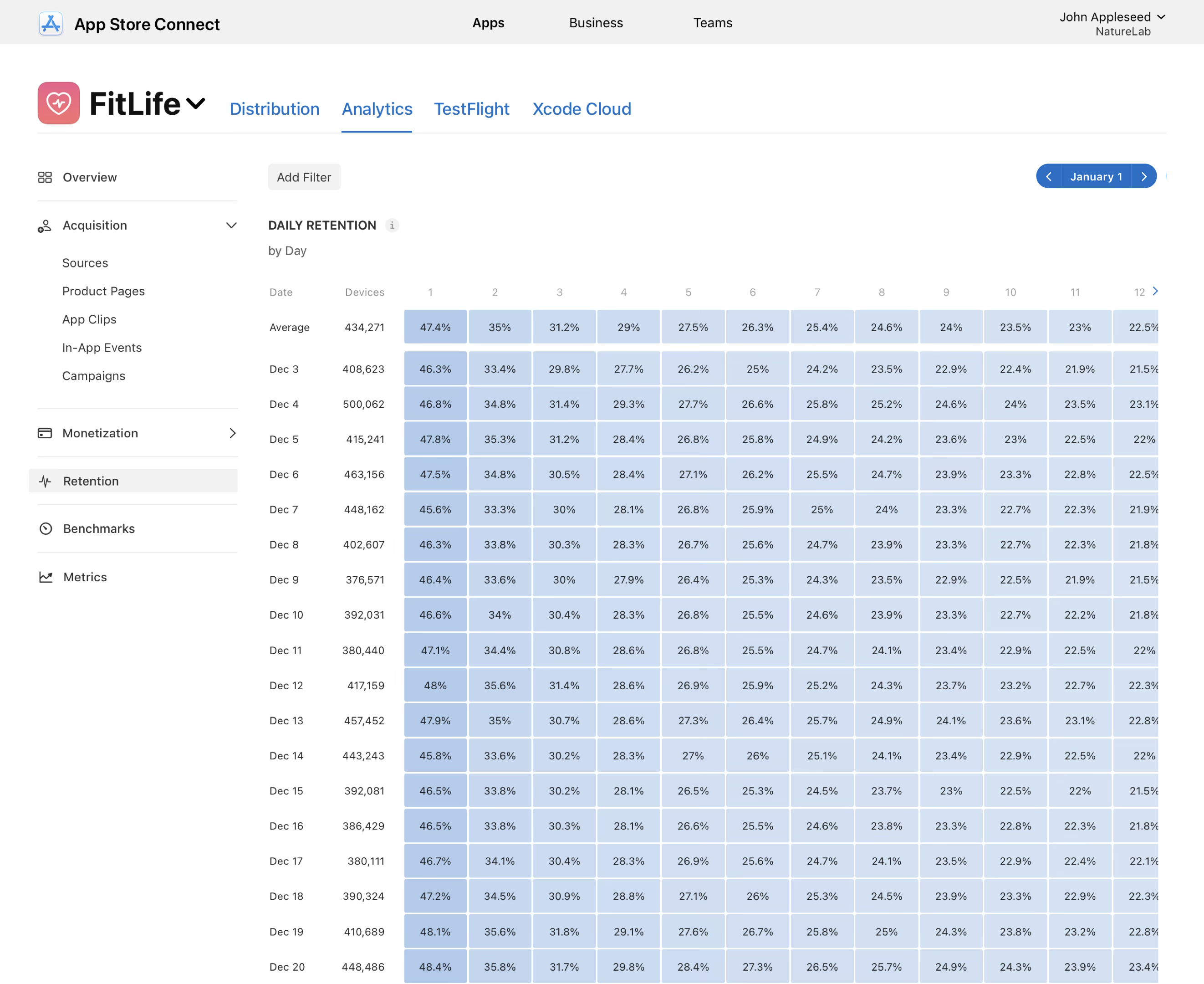 필터를 추가하면 유지율 데이터를 세분화하여 어떤 사용자가 언제 앱을 실행하는지 더욱 정확하게 이해할 수 있습니다.