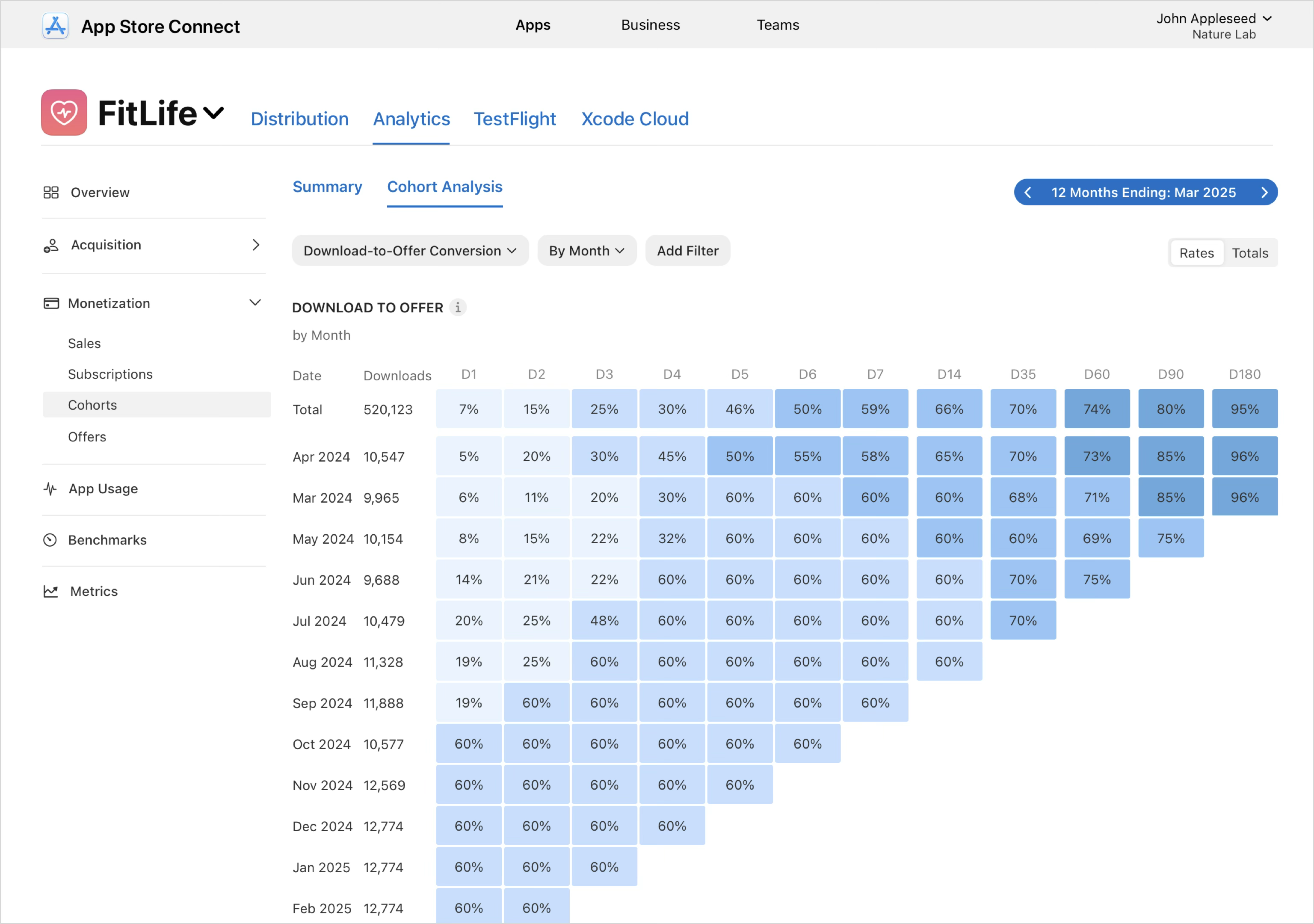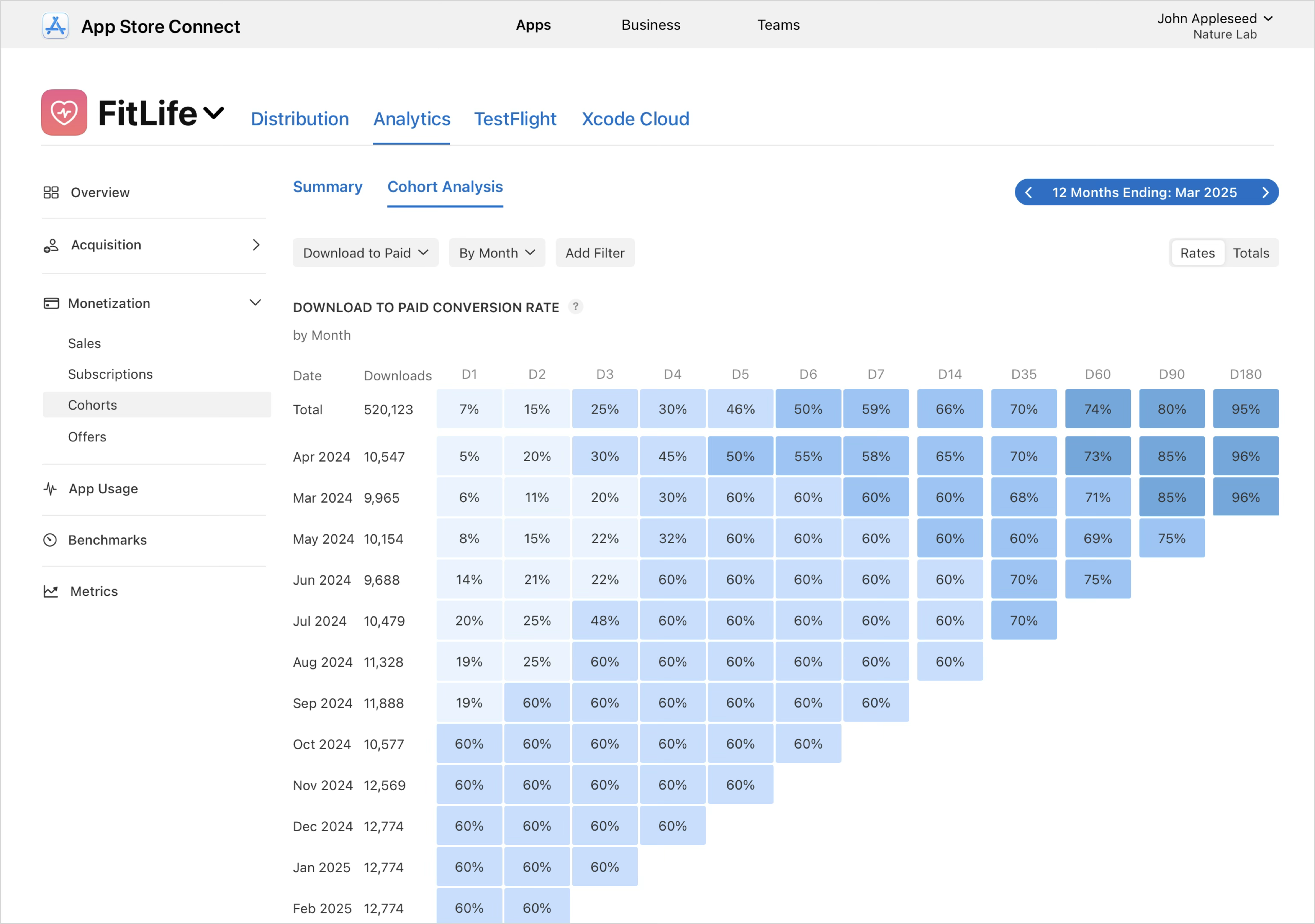 “다운로드에서 유료” 지표를 선택하는 경우, 각 행은 같은 달에 앱을 다운로드한 사용자 집단을 나타내며, 각 열(D1, D2, D3 등)은 해당 집단에서 다운로드 후 특정 날짜 이내에 유료 구독이나 앱 내 구입과 같은 유료 거래를 완료한 비율을 표시합니다. 해당 보기를 통해 시간에 따라 다운로드가 수익으로 전환되는 효율에 대해 이해할 수 있으며, 집단 전반에 걸친 수익화 실적을 비교하고, 온보딩, 가격, 프로모션 또는 유입 경로 품질의 변경이 미치는 영향을 평가할 수 있습니다. 구매 유형, 구독 그룹, 특가 유형, 국가 및 지역 또는 기기와 같은 필터를 사용하여 특정 세그먼트를 분석할 수 있으며, 요금 및 합계를 전환하여 유료 사용자의 비율 또는 절대 합계로 전환 실적을 확인할 수 있습니다.