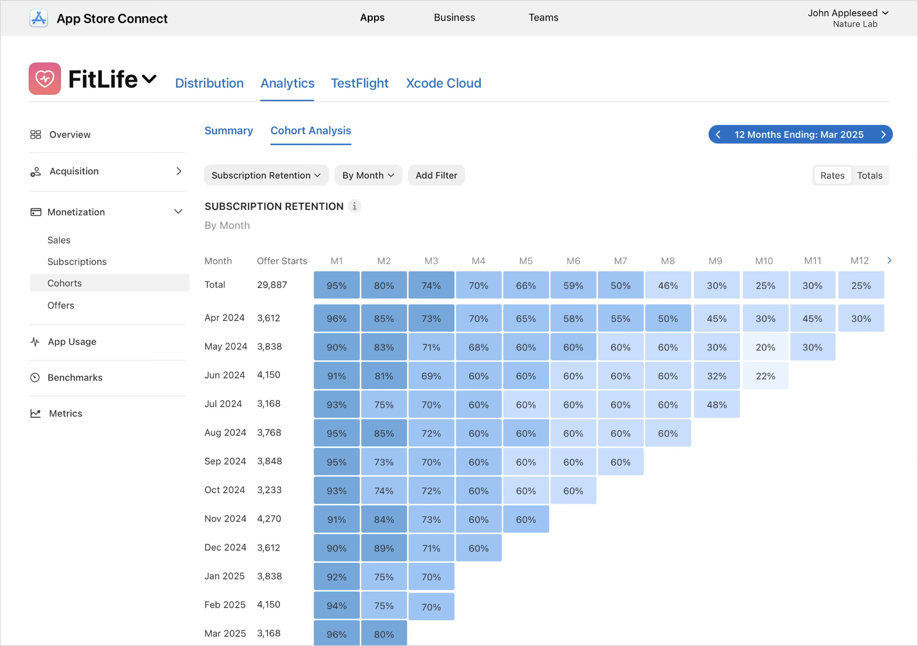 구독 유지율 지표를 선택하는 경우, 각 행은 같은 달에 시작된 구독 집단을 나타내며, 각 열(M1, M2, M3 등)은 해당 집단이 그 후로 여러 달이 경과한 후 활성화된 유료 구독을 유지하는 비율을 표시합니다. 해당 보기를 통해 집단 간의 유지율 추세를 비교할 수 있으며, 시간에 따른 개선 또는 회귀를 발견하고, 신규 프로모션, 가격 또는 앱 업데이트와 같은 변경 사항이 장기 구독자 유지율에 어떤 영향을 미치는지 알아볼 수 있습니다. 구독 그룹, 특가 유형, 국가 및 지역 또는 기기와 같은 필터를 사용하여 특정 세그먼트를 분리할 수 있으며, “요금”과 “합계”를 전환하여 유지율을 백분율 또는 절대 구독 수로 확인할 수 있습니다.