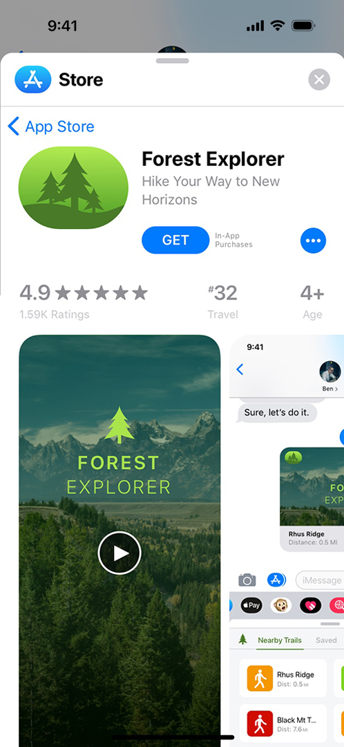 앱이 승인되면 전 세계 수백만 명의 고객에게 제공됩니다. 마케팅은 사용자가 앱을 즉시 다운로드할 때 가장 큰 영향력을 발휘할 수 있으므로, App Store URL 끝에?app=messages를 추가하여 iMessage용 App Store의 제품 페이지에 바로 연결되도록 합니다. URL에 이미 앱 분석 캠페인 링크나 기타 쿼리 매개변수가 포함된 경우 &app=messages를 App Store URL 끝에 추가합니다.