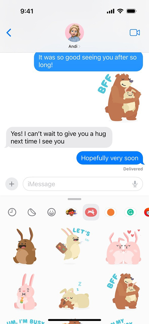 사용자가 다양한 방식으로 자신을 표현하도록 iMessage용 App Store에서 다운로드할 수 있는 스티커를 제작해 보세요.