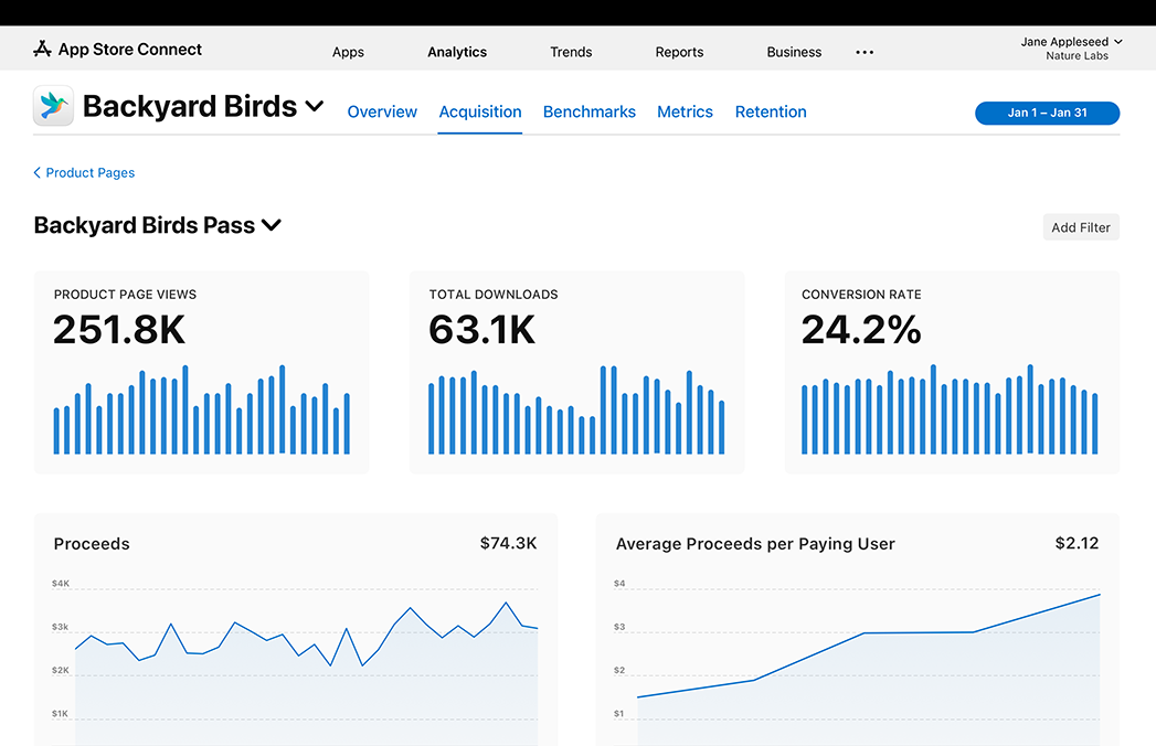Apple에서 제공하는 고유한 데이터 통찰력을 활용하여 App Store에서 앱의 실적을 측정하고 비즈니스를 성장시키세요. Apple은 매달 수십억 개의 데이터 포인트를 수집하여 개발자에게 다음을 비롯한 중요한 정보를 제공합니다.