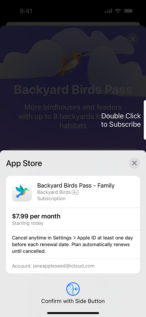 구입 프로세스가 시작되면 App Store 결제 시트에 관련 세부 정보가 표시되며, 사용자는 이를 통해 구입을 확정하기 전에 거래(상품 또는 서비스의 유형, 가격, 구독 기간 등) 정보를 간편하게 파악할 수 있습니다.