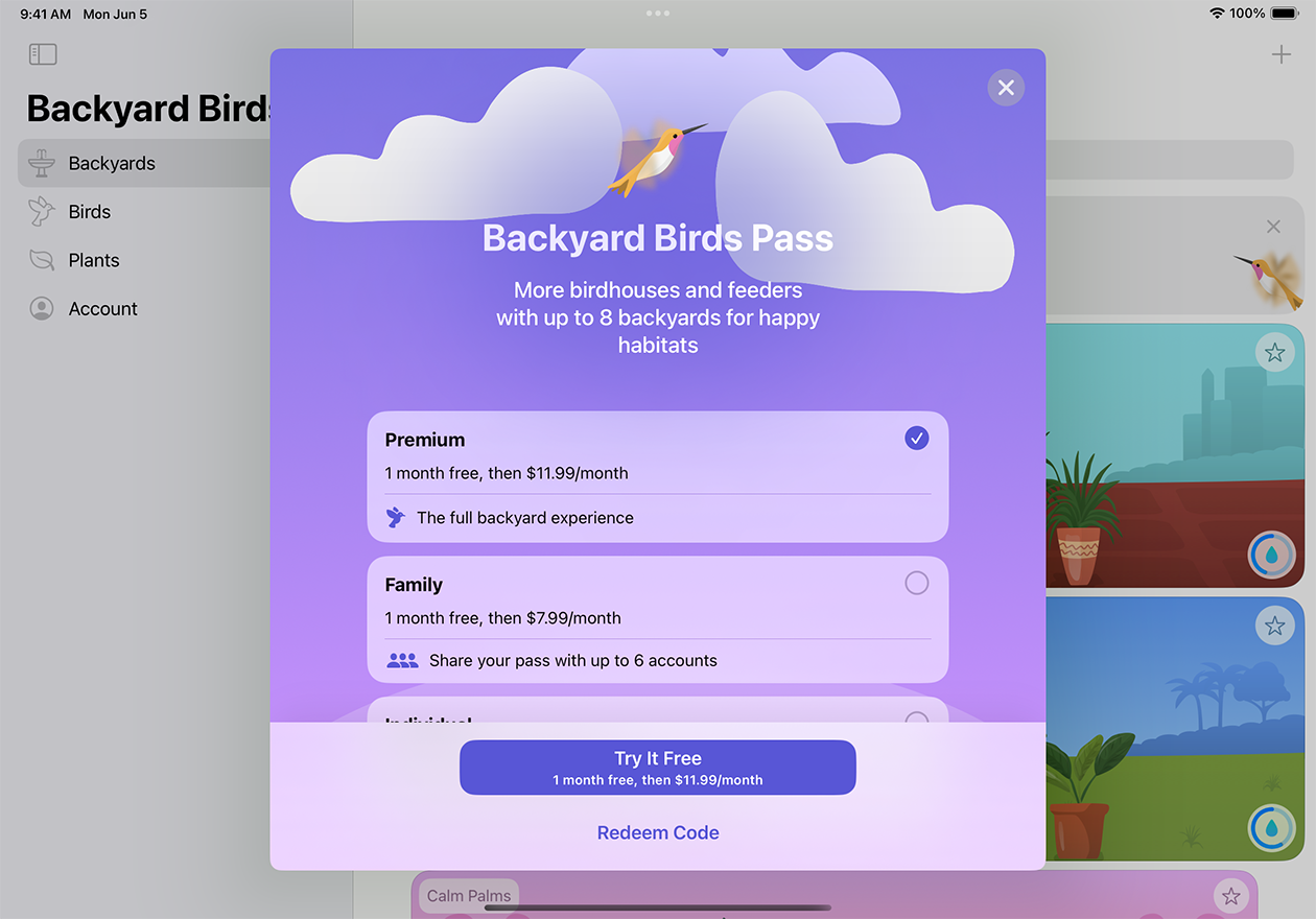 자동 갱신 구독의 특정 기간 동안 할인된 가격 또는 무료 이용 혜택을 통해 구독자를 확보하고 이들이 계속 참여하도록 유도하세요. App Store에서의 거래는 인증되므로 사기 가능성(예: 한 계정에서 무료 체험을 여러 번 사용)이 최소화됩니다.