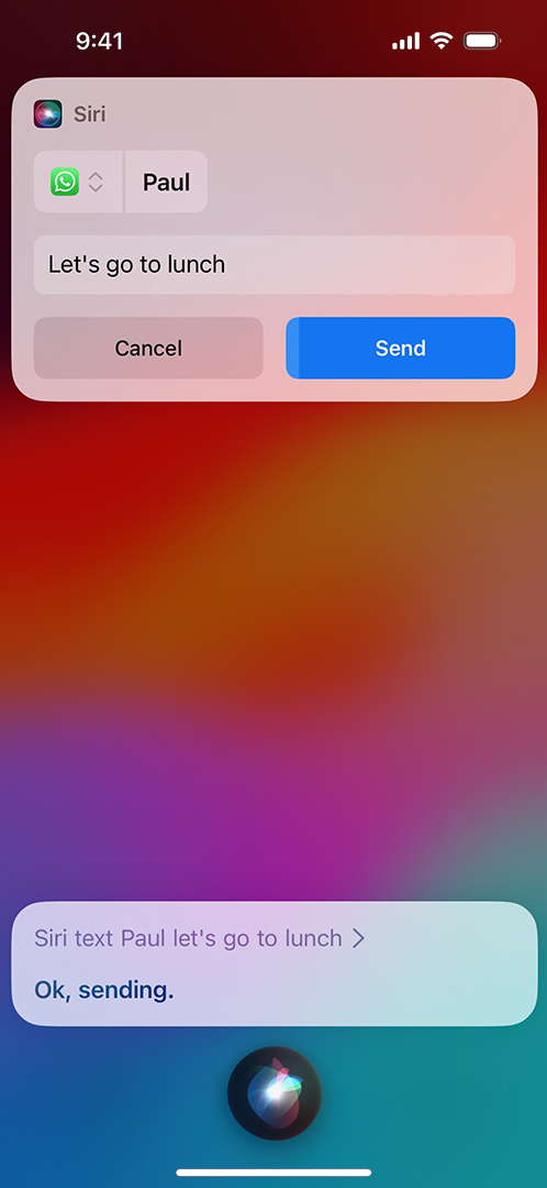 사용자가 연락처에 있는 지인에게 메시지를 보내거나 전화를 걸 때 사용할 앱의 이름을 말하지 않아도 Siri가 가장 적합한 앱을 선택합니다. 또한 Siri는 시스템 인텔리전스를 통해 오디오 메시지, 메시지 편집 또는 전송 취소 기능, 풍부한 첨부 파일 정보 읽기, 빠른 연락처 식별을 지원합니다.