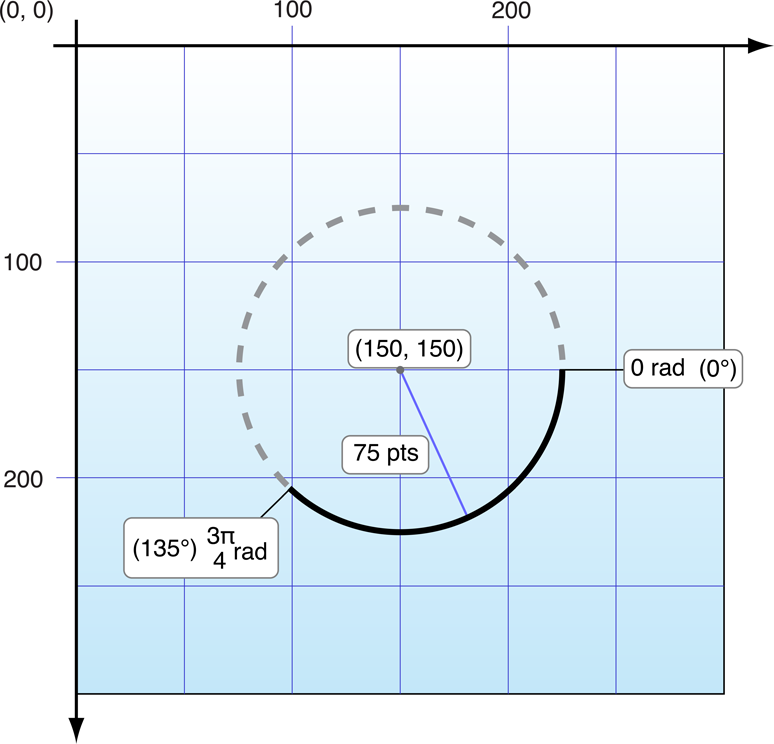 The UIBezierPath class provides support for initializing a new path object with an arc segment. The parameters of the bezierPathWithArcCenter:radius:startAngle:endAngle:clockwise: method define the circle that contains the desired arc and the start and end points of the arc itself. Figure 2-2 shows the components that go into creating an arc, including the circle that defines the arc and the angle measurements used to specify it. In this case, the arc is created in the clockwise direction. (Drawing the arc in the counterclockwise direction would paint the dashed portion of the circle instead.) The code for creating this arc is shown in Listing 2-2.