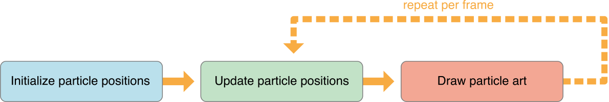 One technique that benefits from transform feedback is animated particle effects. A general architecture for rendering a particle system is illustrated in Figure 6-4. First, the app sets up the initial state of the particle simulation. Then, for each frame rendered, the app runs a step of its simulation, updating the position, orientation, and velocity of each simulated particle, and then draws visual assets representing the current state of the particles.