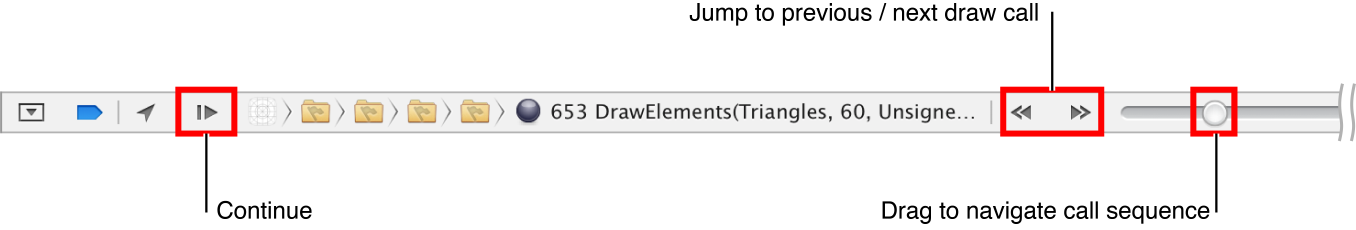 The debug bar provides multiple controls for navigating the captured sequence of OpenGL ES commands (shown in Figure B-12). You can use its menus to follow the hierarchy shown in the frame navigator and choose a command, or you can use the arrows and slider to move back and forth in the sequence. Press the Continue button to end frame debugging and return to running your application.