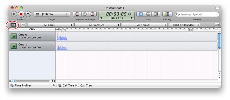 If you’re developing applications that run on iPad 2, you can use the CPU strategy in Time Profiler to measure activity on each CPU core. An application that supports concurrency should show evidence of activity on both iPad 2 cores at the same time.