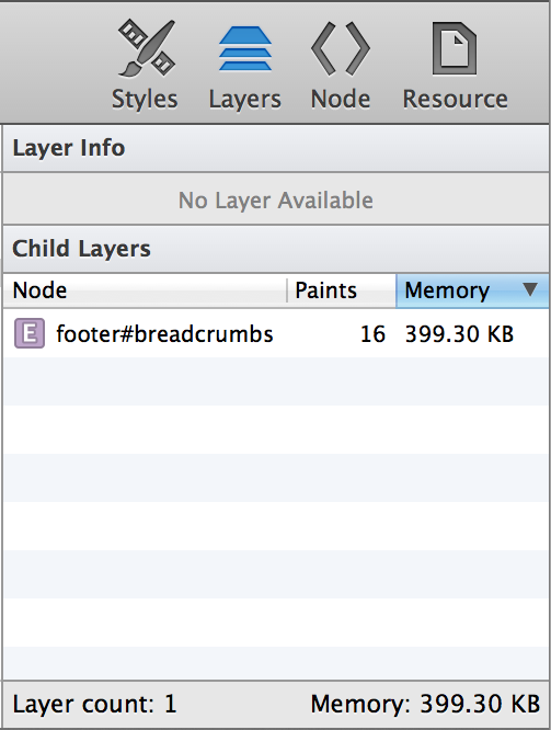 The Layer details sidebar provides information about what is composited as a layer. Elements that have a 3D transform, a fixed position, or overlap other composited elements are rendered in their own layer so that its movement during animations or scrolling can be hardware-accelerated for maximum performance.