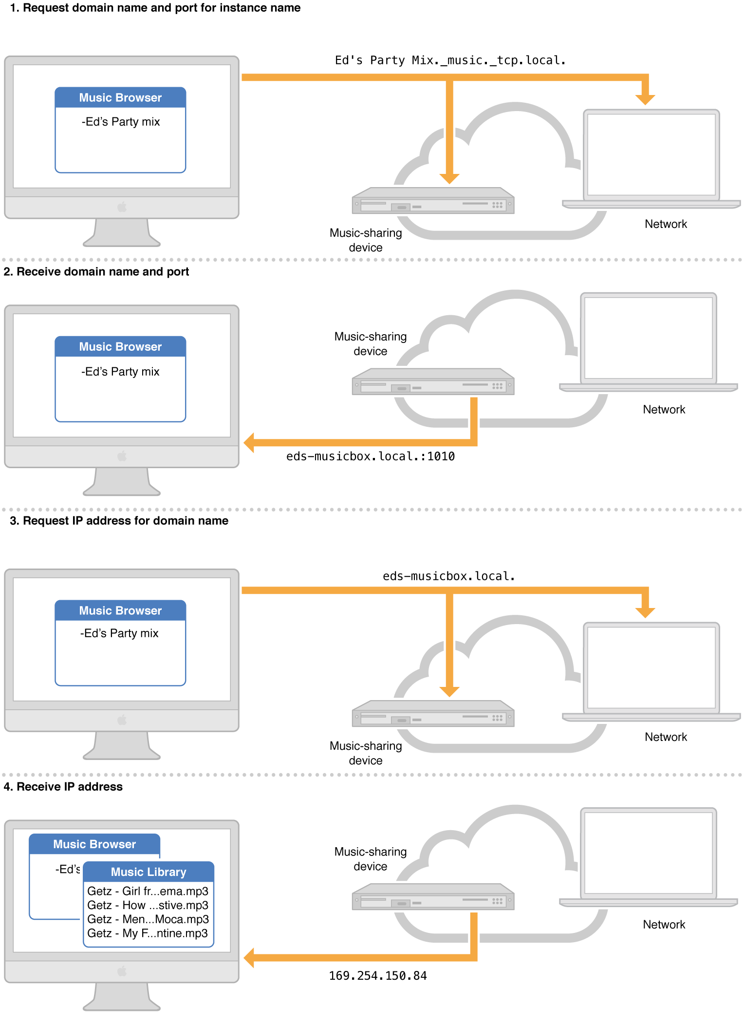 In step 1, the device randomly selects the link-local IP address 169.254.150.84, randomly selected from the IPv4 link-local range 169.254.0.0 with a subnet mask of 255.255.0.0, and announces it to the network. Because no devices respond to the announcement, the device takes the address as its own. In step 2, it starts up its own Multicast DNS responder, requests the host name eds-musicbox.local., verifies its availability, and takes the name as its own. Next, in step 3, the device starts up a music sharing service on TCP port 1010. Finally, in step 4, it publishes the service, of type _music._tcp, under the name Ed’s Party Mix, in the local. domain, first making sure that no service exists under the same name. This creates two records: