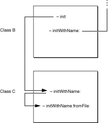 This figure omits an important detail. The initWithName:fromFile: method, being the designated initializer for the C class, sends a message to super to invoke an inherited initialization method. But which of B’s methods should it invoke, init or initWithName:? It can’t invoke init, for two reasons: