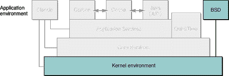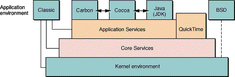 Figure 3-2 shows the relationship between Darwin and OS X. Both build upon the same kernel, but OS X adds Core Services, Application Services and QuickTime, as well as the Classic, Carbon, Cocoa, and Java (JDK) application environments. Both Darwin and OS X include the BSD command-line application environment; however, in OS X, use of environment is not required, and thus it is hidden from the user unless they choose to access it.