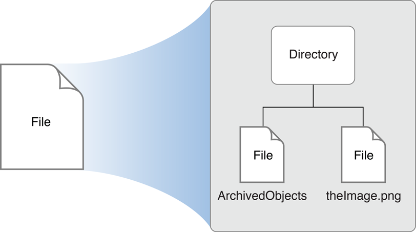 If your app needs to manipulate directly a document file that is a file package, you should override the readFromFileWrapper:ofType:error: method instead of readFromData:ofType:error:. For example, if your document contains an image file and a text file, you can store both in a file package. A major advantage of this arrangement is that if only one of those objects changes during an editing session, you don’t need to save both objects to disk but can save just the changed one. Figure 6-1 shows a file package containing an image file and an object archive.