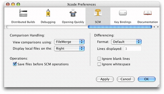 The “View comparisons using” pop-up menu lets you choose the tool you want Xcode to invoke when you execute the Compare command. You can choose between FileMerge, BBEdit, or Other to specify an application of your choosing.