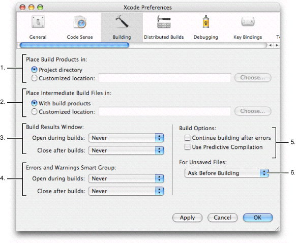 5. Build Options. These options let you choose how Xcode reacts to build errors and whether Xcode tries to speed up the build process by using Predictive Compilation. The options are: