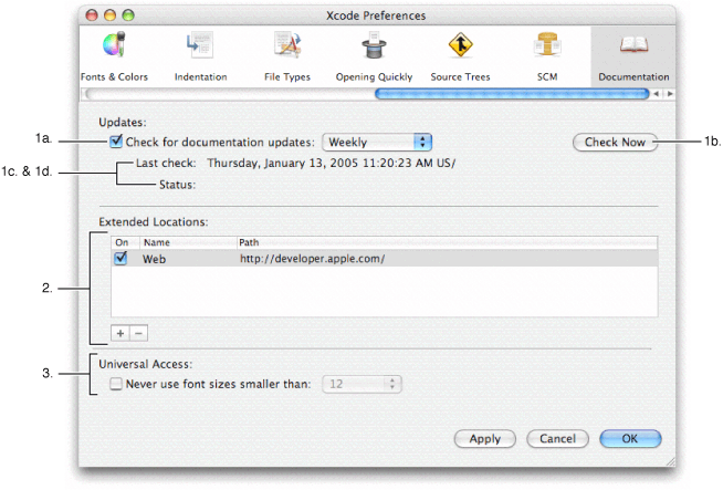 3. Universal Access. These options control how Xcode displays documentation in its documentation window. The “Never use font sizes smaller than” option specifies whether Xcode enforces a minimum font size for HTML pages that it displays in the documentation window. When this option is selected, Xcode uses the minimum font size—specified in the pop-up menu—to display all text that uses a smaller font size. This option is disabled by default.