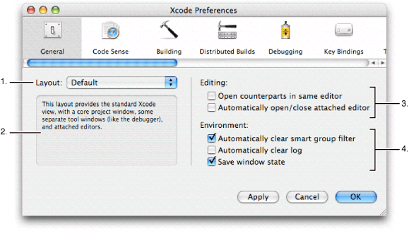 3. Editing options. These options control Xcode’s windowing policy for editor windows. See The Xcode Editor Interface to learn more about Xcode’s editor. The options are: