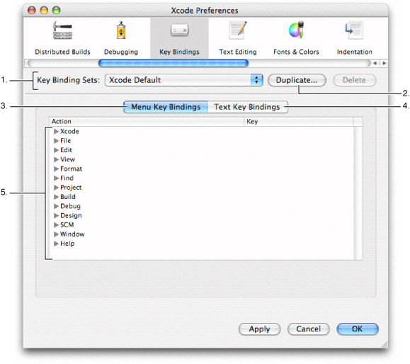 1. Key Bindings Sets. This menu lets you choose which set of key bindings are in effect. Xcode provides four predefined sets: Xcode Default, BBEdit Compatible, Metrowerks Compatible, and MPW Compatible. You can also add your own custom sets of key bindings.