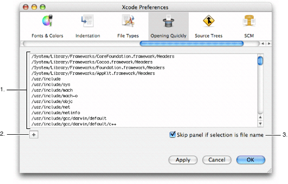 1. The list of directories that Xcode uses to find and open files, one directory per line. Paths to a number of common directories—such as System/Library/Frameworks—are already included in this list by default. Open Quickly searches the directories in the order in which they appear in this list.