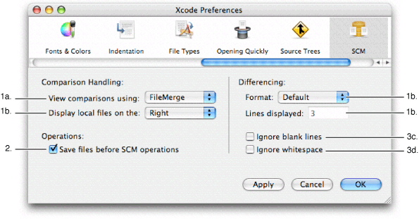 2. Operations. The “Save files before SCM operations” option specifies whether Xcode automatically saves changed files before performing any version control operations. This option is on by default.