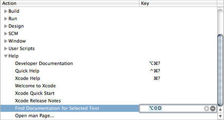 The following steps describe how to create a custom set of key bindings, based on the Xcode Default set, and how to add a keyboard shortcut. In this example, the keyboard shortcut performs a full-text documentation search.