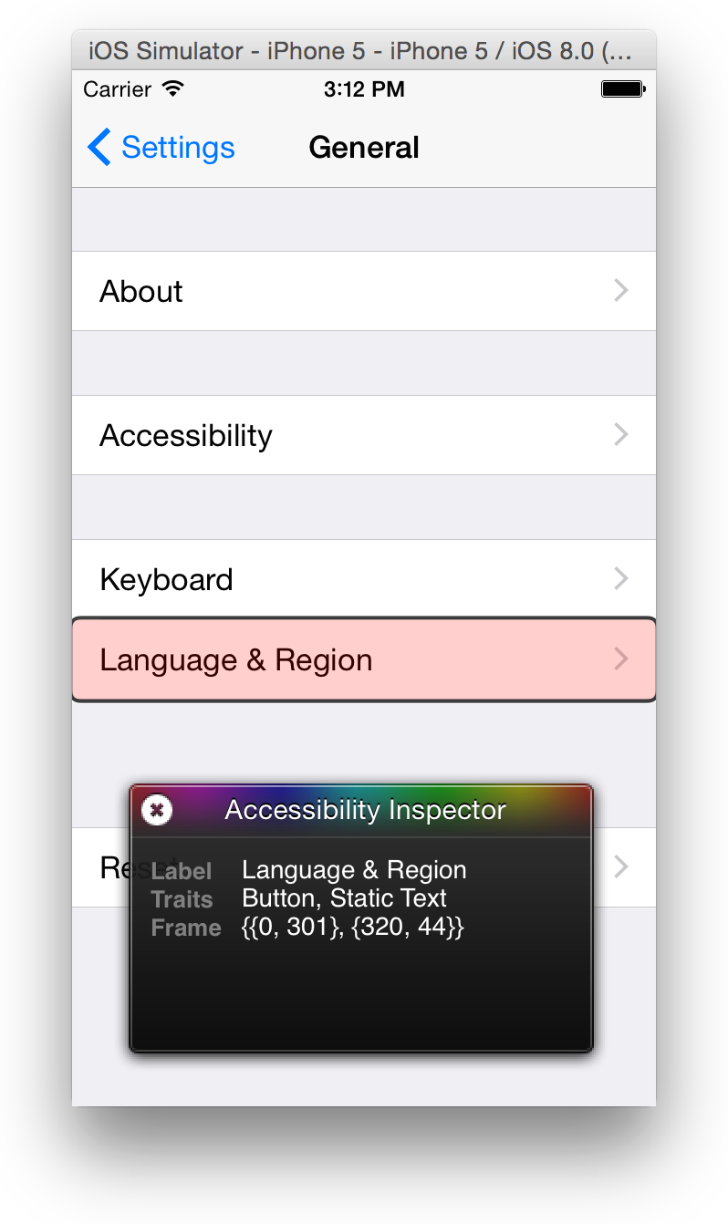 Use the Accessibility Inspector to test the accessibility of your app. The Accessibility Inspector displays accessibility information about each accessible element in an app. Figure 5-1 shows what the Accessibility Inspector looks like as it runs in Simulator.
