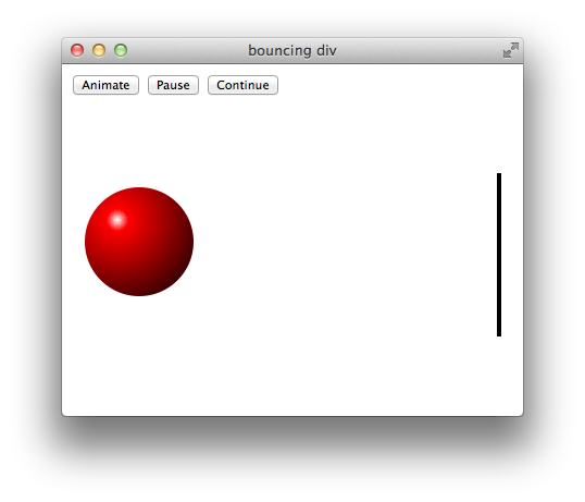 Listing 6-4 creates three buttons and a round div element with a radial gradient background. The first button animates the div element by changing its class name. The second and third buttons pause and continue the animation by setting the div element’s style.webkitAnimationPlayState property. Figure 6-3 illustrates the result.