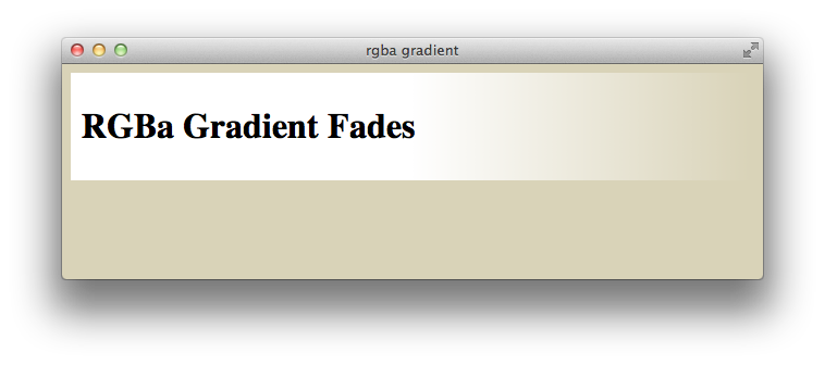 Use RGBa colors in a gradient to soften or fade colors into the background by decreasing the alpha value of the gradient. For example, Listing 1-1 creates a div element with a white background that fades to transparent. Two consecutive white color stops are used, so the div element’s background stays white for 50% of its width and then fades into the background of the element’s parent. Figure 1-6 shows the result.