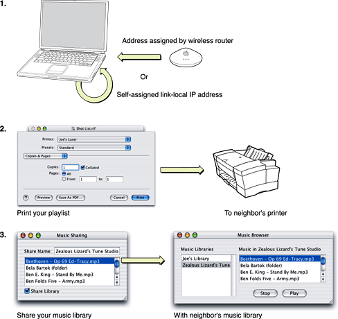This scenario is illustrated in Figure 1-1. In step 1, you open up your laptop in your neighbor’s house, and the laptop either obtains an address from the DHCP server in the router or, in the absence of a DHCP server, assigns itself an available local address. In step 2, the network is queried for available printers so that when you open the Print dialog, your neighbor’s printer is listed. Finally, in step 3, you turn on music sharing on your computer, and your neighbor’s computer sees it and connects.