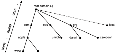 At the top of the inverted tree is the root domain. Below it are some of the top-level domains: com., edu., and org., and the local Bonjour “domain” local., discussed further in Bonjour and the Local Link. Below the top level are a few second-level domains, apple, darwin, and zeroconf. The tree can extend infinitely downward with, for example, www, at the third level.
