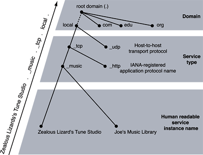Figure 1-3 illustrates the organization of the name of a Bonjour service instance. At the top level of the tree is the domain, such as local. for the local network. Below the domain is the service type, which consists of the protocol name preceded by an underscore (_music) and the transport protocol, also preceded by an underscore (_tcp). At the bottom of the tree is the human-readable service instance name, such as Zealous Lizard’s Tune Studio. The complete name is a path along the tree from bottom to top, with each component separated by a dot.