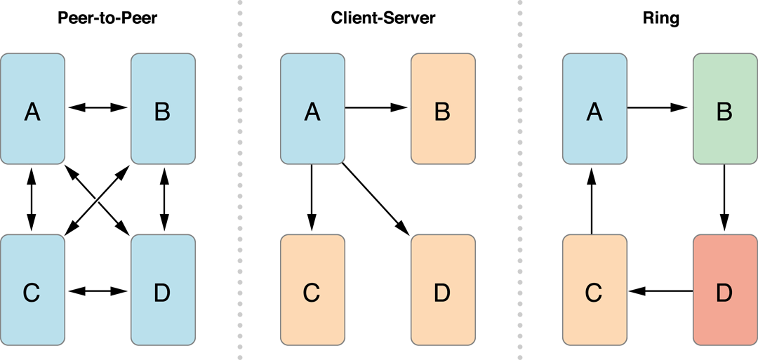 Although the GKMatch object creates a full peer-to-peer connection between all the participants, you can reduce the network traffic by layering a ring or client-server networking architecture on top of it. Figure 7-1 shows three possible network topologies for a four-player game. On the left, a peer-to-peer game has 12 connections between the various devices. However, you could layer a client-server architecture on top of this by nominating one of the devices to act as the host. If your game transmits to or from the host only, you can halve the number of connections. A ring architecture allows devices to forward network packets to the next device only, but further reduces the number of connections. Each topology provides different performance characteristics, so you will want to test different models to find one that provides the performance your game requires.